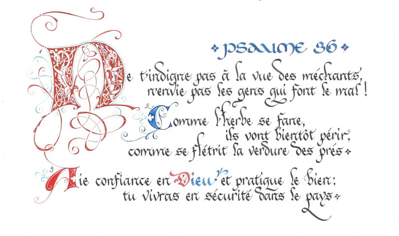 Jane vous propose trois jours d’initiation, ou de continuation, en calligraphie lente et méditative, sur un projet de votre choix (par exemple une prière, un Psaume, un verset de la Bible, ou un court texte sur la spiritualité). Plusieurs styles d’écriture sont possibles : bâtarde française, minuscule ou majuscule celtique (dit « insulaire »), onciale ou gothique. Pour illustrer et enluminer vos textes, on va se régaler avec des motifs celtiques : entrelacs, spirales et initiales zoomorphes ! Un moment de recueillement et de calme ; une occasion de travailler les mots sacrés avec amour, beauté et finesse !